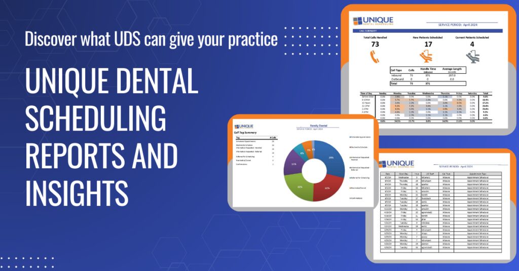 At Unique Dental Scheduling, we understand that behind every call is a patient—and behind every patient is an opportunity to grow your practice. That’s why we do more than answer phones and schedule appointments—we track, report, and analyze everything we do, so your team has a clear picture of what’s working, what isn’t, and where to improve.